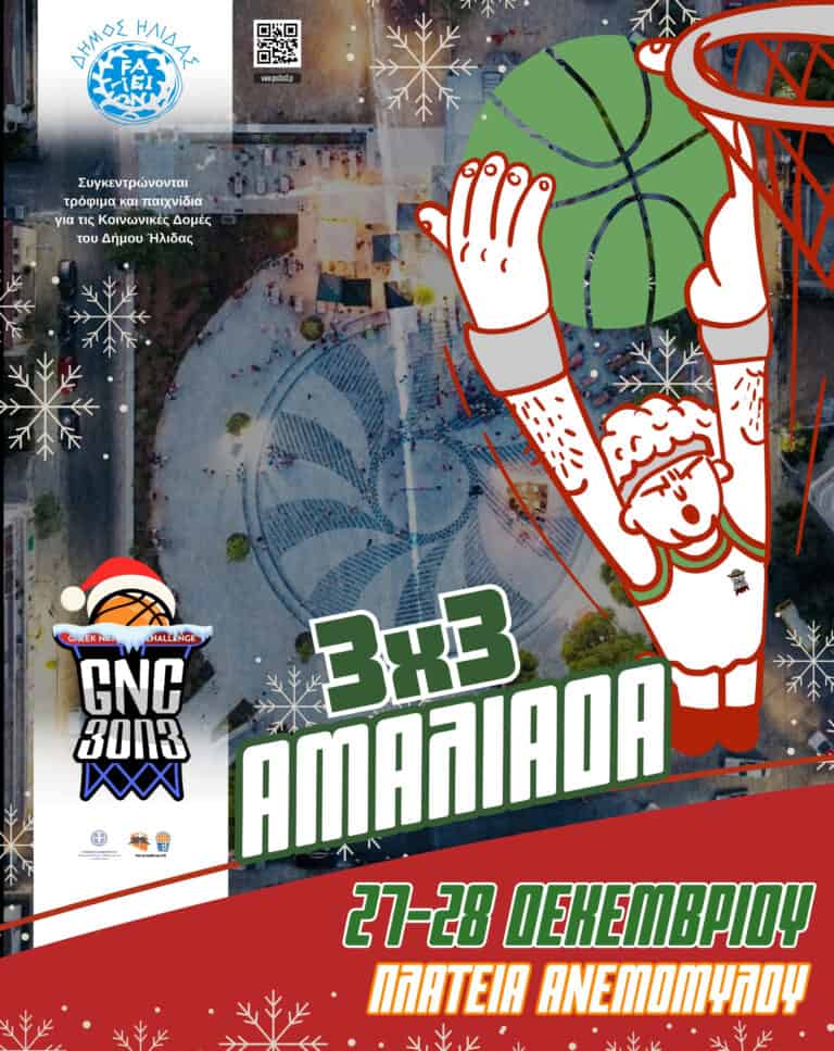 Τα Χριστούγεννα στον Δήμο Ήλιδας γίνονται… μπασκετικά! Το GNC 3on3 | ΑΜΑΛΙΑΔΑ 2025 (Christmas Edition) έρχεται στις 27–28 Δεκεμβρίου για να γεμίσει την Πλατεία Ανεμομύλου με δράση, χαμόγελα, αθλητισμό και προσφορά. Η διοργάνωση, που πραγματοποιείται από τον Δήμο Ήλιδας, είναι αφιερωμένη στα παιδιά και στις οικογένειες της πόλης, μετατρέποντας την πλατεία σε μια μεγάλη χριστουγεννιάτικη γιορτή μπάσκετ. Παράλληλα, στηρίζουμε όσους έχουν ανάγκη, καθώς τα τρόφιμα και τα παιχνίδια που θα συγκεντρωθούν θα δοθούν στις Κοινωνικές Δομές του Δήμου Ήλιδας. 🎅 ΠΡΟΓΡΑΜΜΑ ΔΙΗΜΕΡΟΥ 📍 27 Δεκεμβρίου⏰ 10:00 – 16:00• Αγώνες όλων των κατηγοριών• Χριστουγεννιάτικες δραστηριότητες• Mini skills challenges για μικρούς αθλητές 📍...